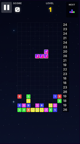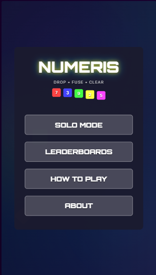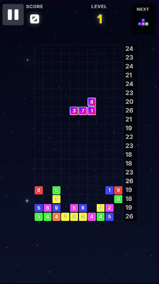 Numeris is a strategy puzzle game where you drop colored blocks with random numbers to clear rows. Match numbers and colors to targets, with clever fusions and rainbow powers to trigger satisfying chain reactions.